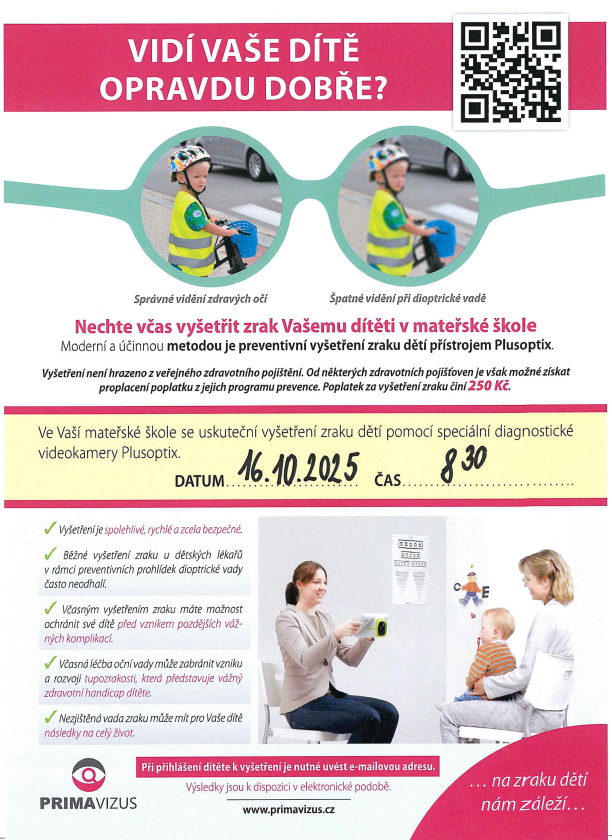Máte zájem o vyšetření zraku vašeho dítěte pomocí speciální diagnostické videokamery Plusoptix? Vyšetření proběhne v naší MŠ. Cena vyšetření 250,-. Více informací u třídních učitelů.